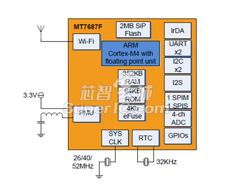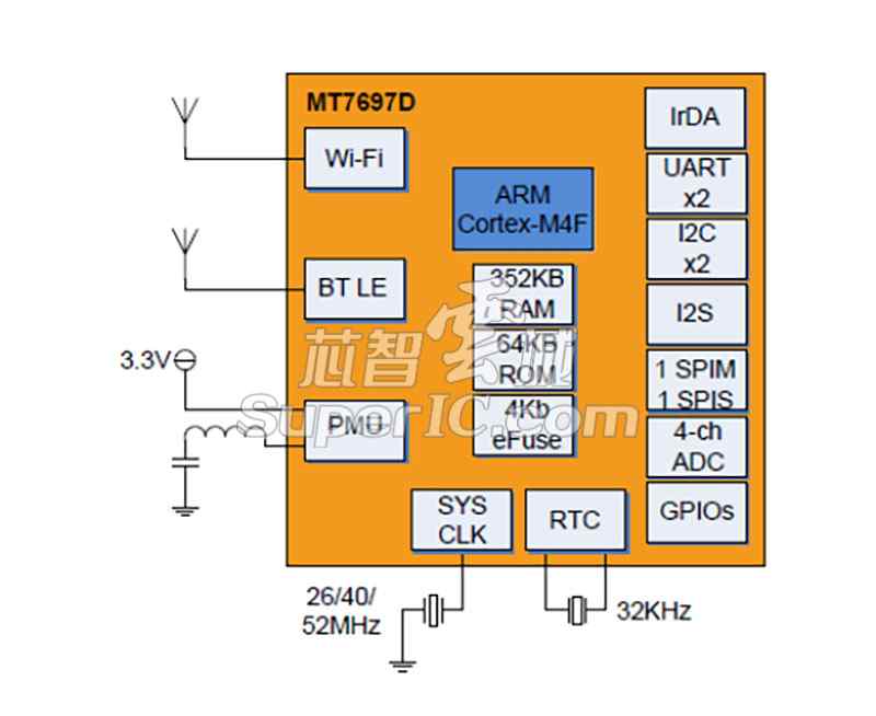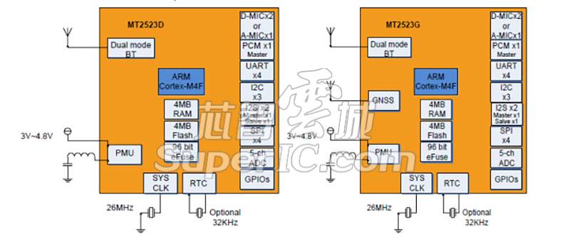 MT7682 、MT7697、MT2523x 是MTK专为物联网(IoT)、可穿戴智能手表等领域设计的系列芯片。集成ARM Cortex-M4内核、RAM、ROM等,具有成本低、体积小、功耗低等特点。